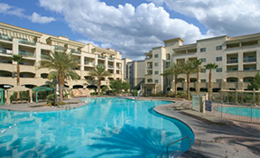 This Mediterranean-themed resort is situated at the southern end of the world-famous Las Vegas Strip and consists of 192 units in 6 buildings, as well as separate maintenance and laundry buildings. Each building includes four levels of time-share suites above a street level parking structure. The resort’s amenities include two courtyard areas, swimming pools, spa, outdoor children’s play area, basketball court, cabanas, barbecue areas, clubhouse, multi-purpose room, fitness rooms and a lazy river that winds through the beautifully landscaped grounds.